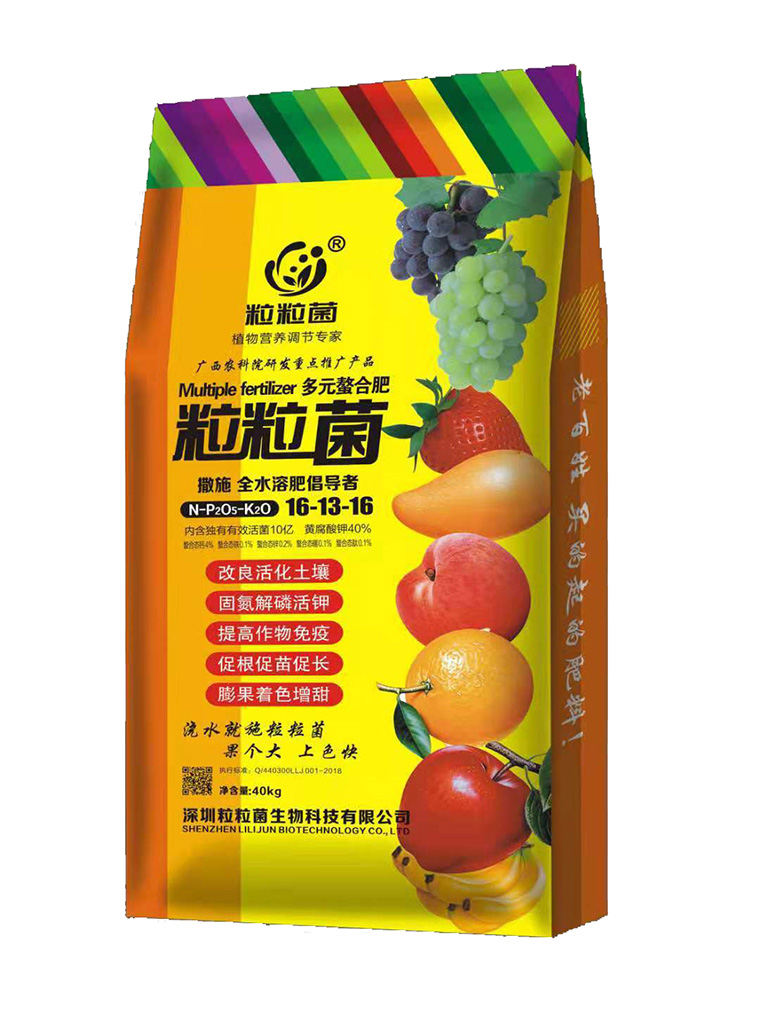 本产品由深圳粒粒菌生物科技有限与广西农业科学院共同研发,本品含大中微量元素,水溶肥原料,含黄腐酸钾能显著提高肥效利用率,能激活土壤中的的大中微量元素,起到保水保肥能力,增强植物的抗能力,起到增产增收的功效,对果树类农产品起到增色,提质,增产的显著效果。